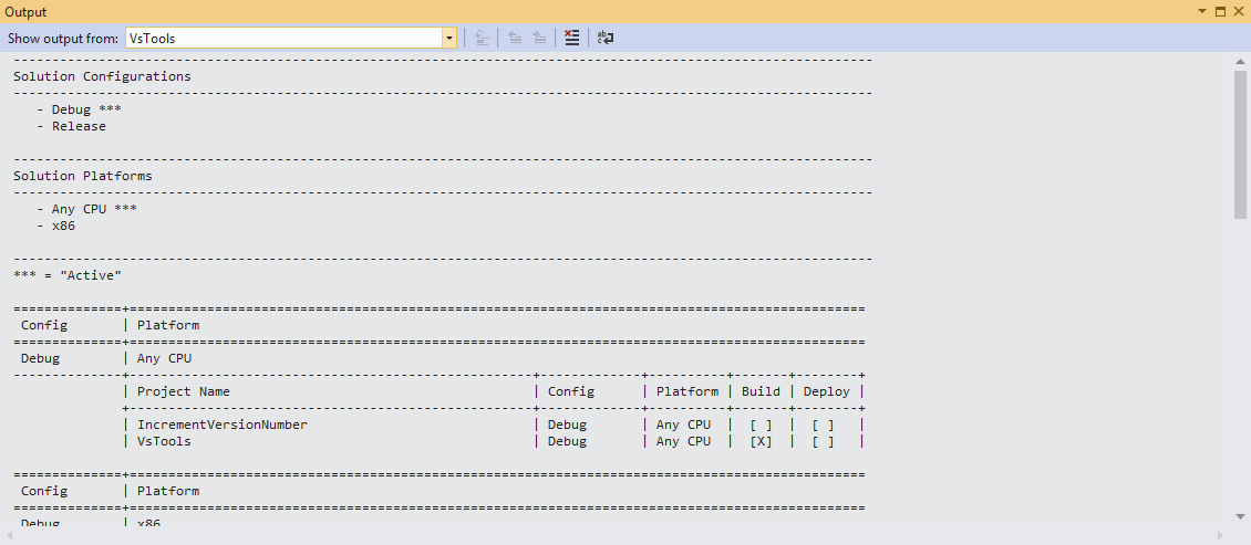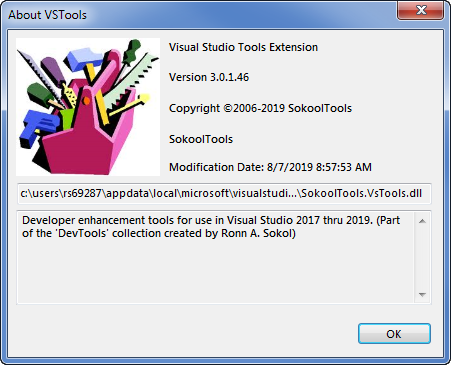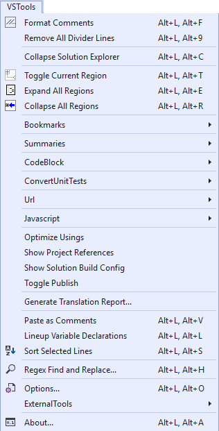 VSTools provides many easy to use feature items available in a new menu item called "VSTools" installed into the main menu of Visual Studio. Its purpose is to aid in the overall development process. It is delivered in the form of a VSIX extension, that when launched automatically installs all necessary files and dependencies.