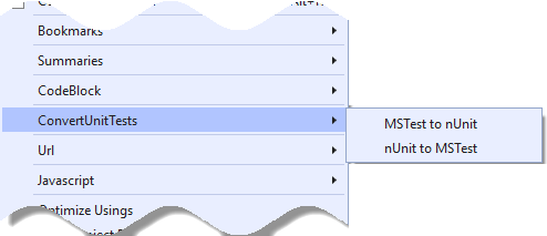 Choose MSTest to nUnit to convert the current MSTest unit tests in the code editor window to nUnit.