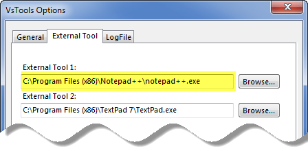 Choose External Tool 1 to run the external application defined using the Options dialog shown by clicking the Options... menu-item :