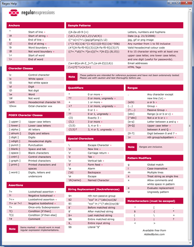 The following dialog is opened when the Regex Help... hyperlink is clicked in the preceding window: