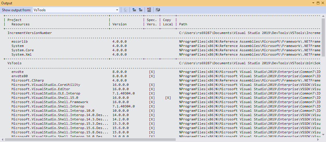 *Columns provided are: 'Assembly Name', referenced 'Version', Is 'Specific Version', Is file 'Copied Local', full 'Path' of the assembly.